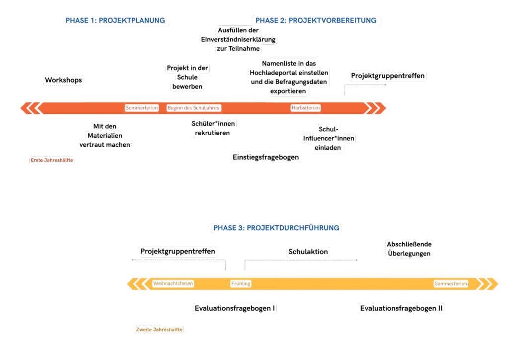Die 10 Sitzungen mit der Projektgruppe umfassen Themen wie respektvolles Miteinander und Problemlösungen und enden mit schulweiten Aktionen. Für die Durchführung der Projektgruppensitzungen wird den Durchführenden nach Teilnahme an der Fortbildung eine Handreichung mit Ablaufplänen und Materialien zur Verfügung gestellt.